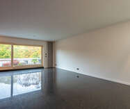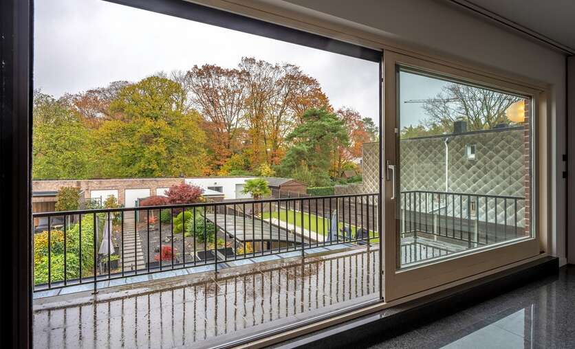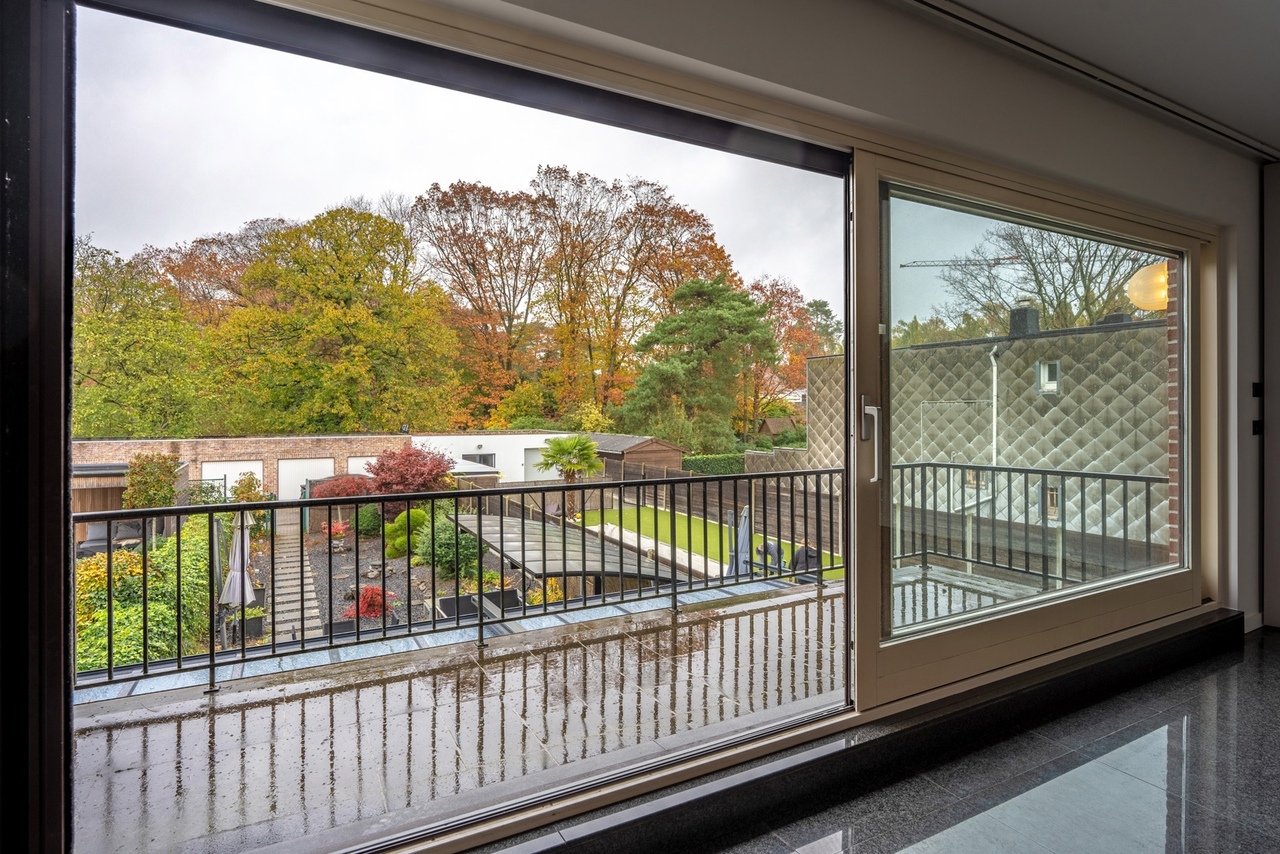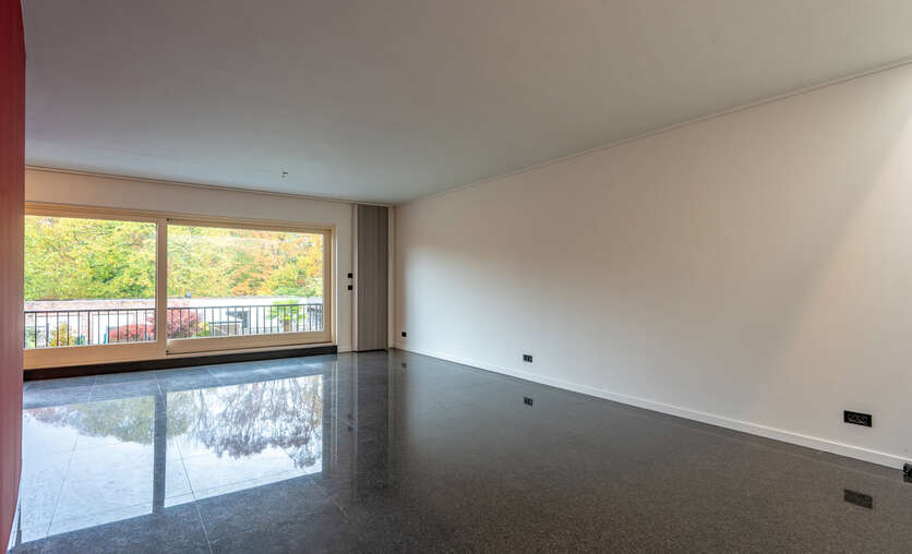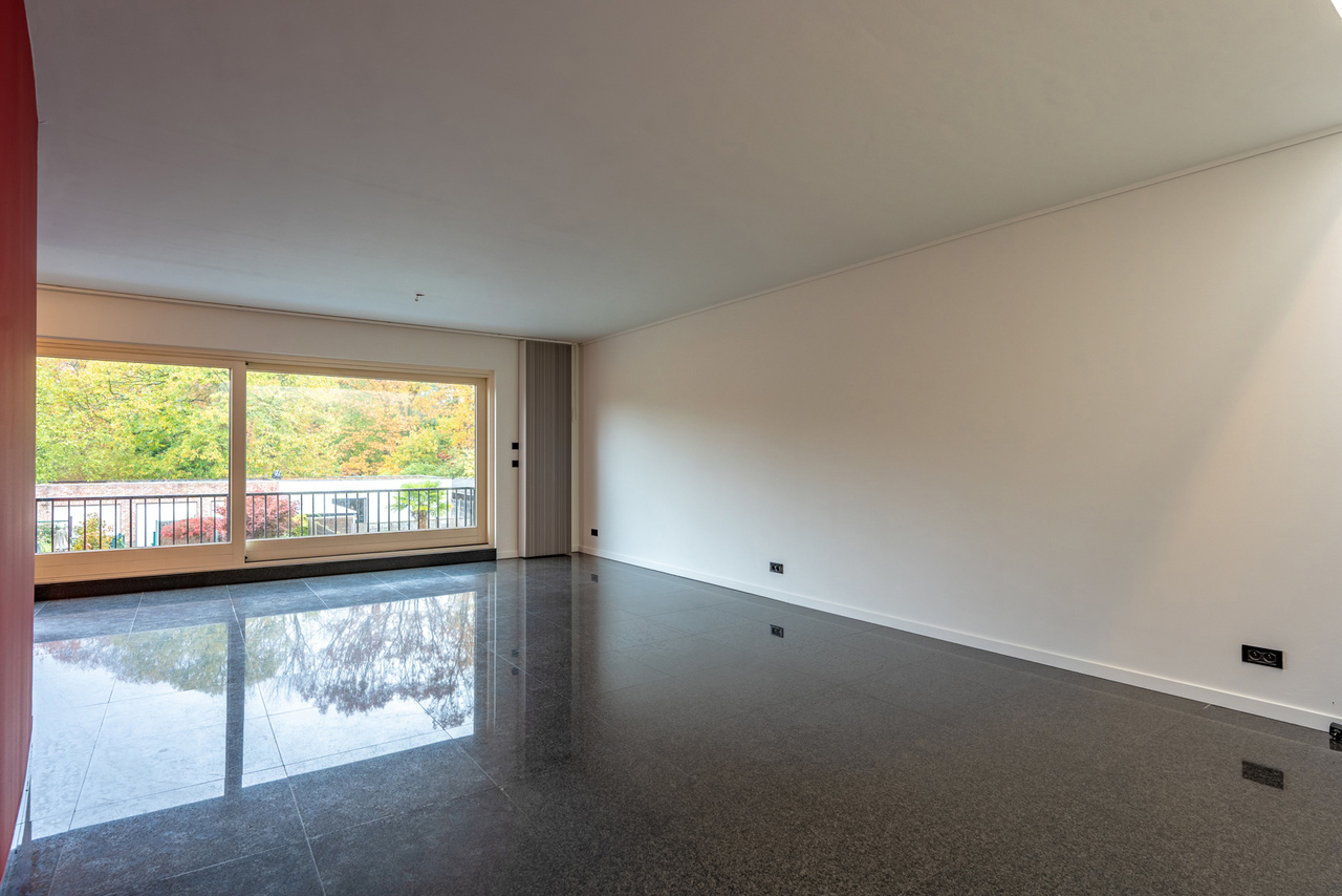 -een ruim leefgedeelte met schuiframen naar het terras.
