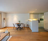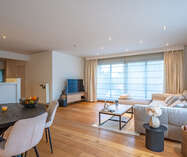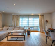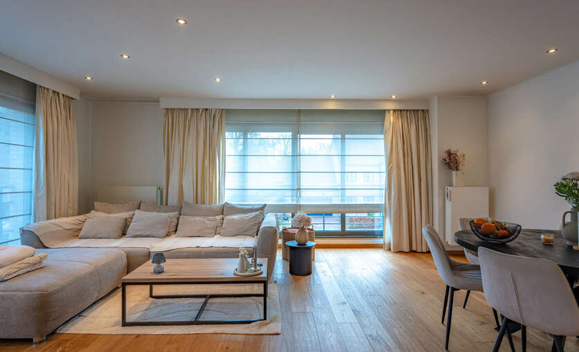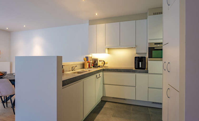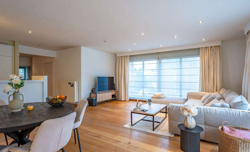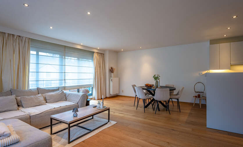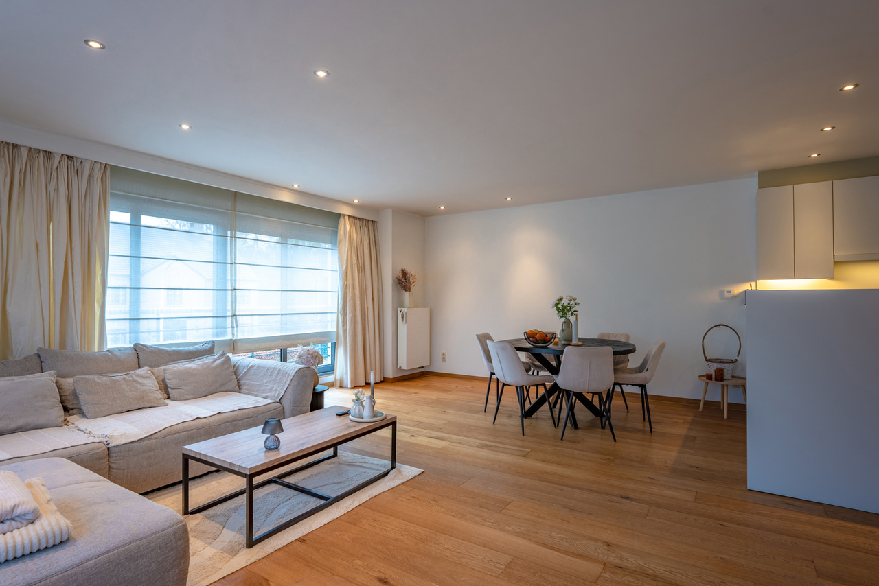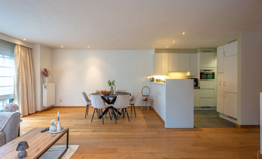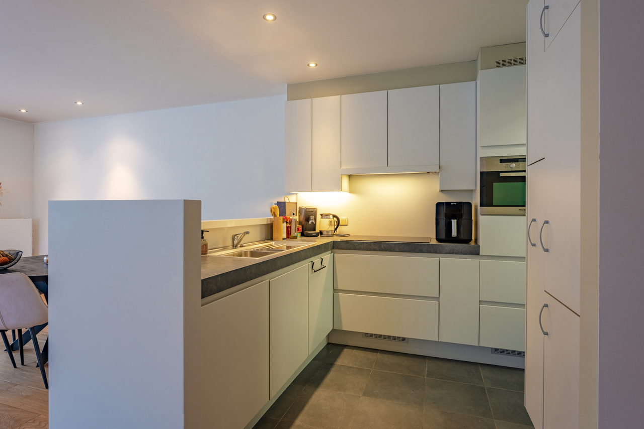 Inkomhal naar royale living (38m²) met open keuken (voorzien van inductievuur - ijskast - vriezer en vaatwasser) met naast gelegen berging/wasruimte, een badkamer en 2 slaapkamers.