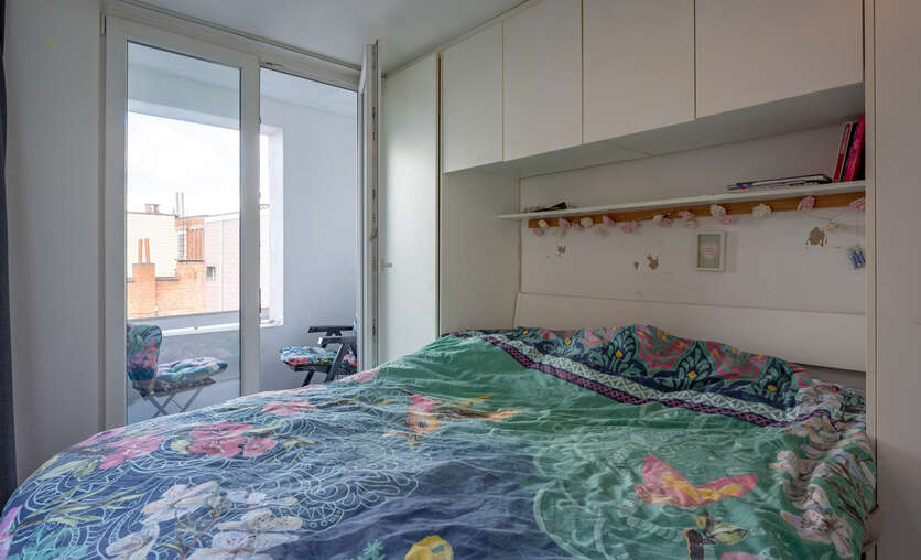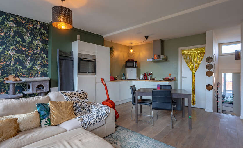 Nabij winkels, openbaar vervoer en diverse invalswegen vinden we dit split-level één slaapkamer appartement. Living met ingemaakte kasten en parket vloer, open keuken voorzien van o.a. vaatwasser en ijskast, badkamer (inloopdouche - toilet & lavabo) en één slaapkamer met overdekt terras. In het gebouw is tevens een ruime kelder voorzien.