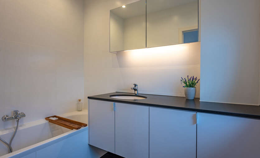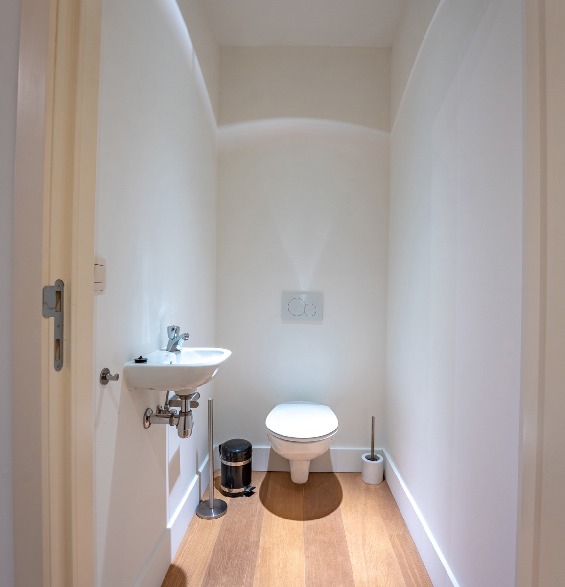 Op de tweede verdieping vinden we een ruime slaapkamer met ensuite badkamer, een tweede slaapkamer, een tweede badkamer en een apart toilet.