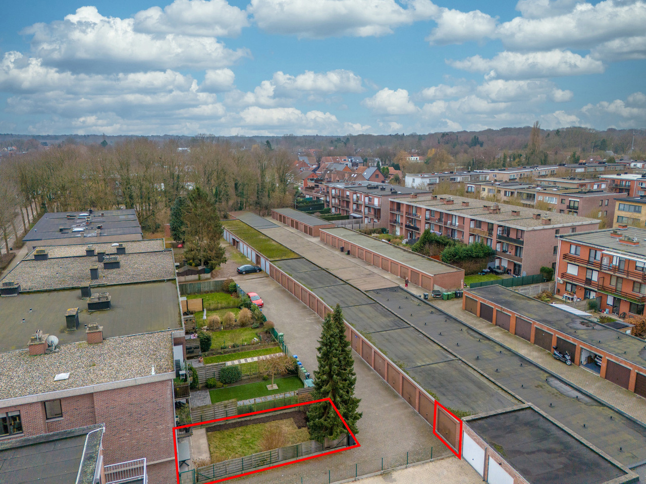 Recht achter het gebouw een standaard garagebox met manuele poort.