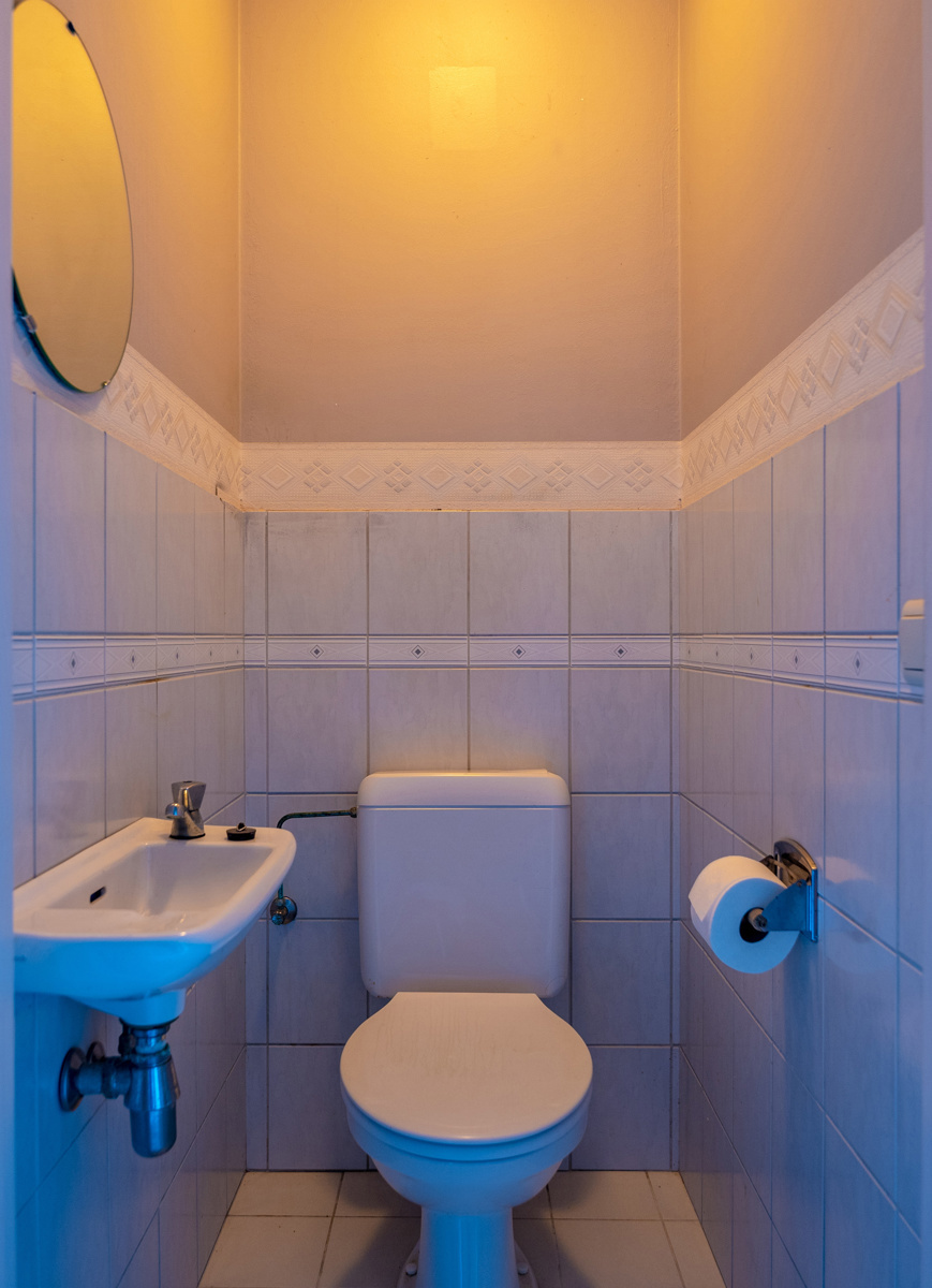 Deze benedenverdieping bevindt zich in een kleinschalig hoekgebouw.