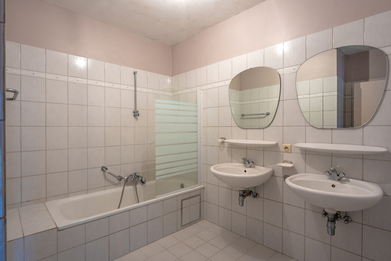 Badkamer met twee lavabo’s en een ligbad/douche.