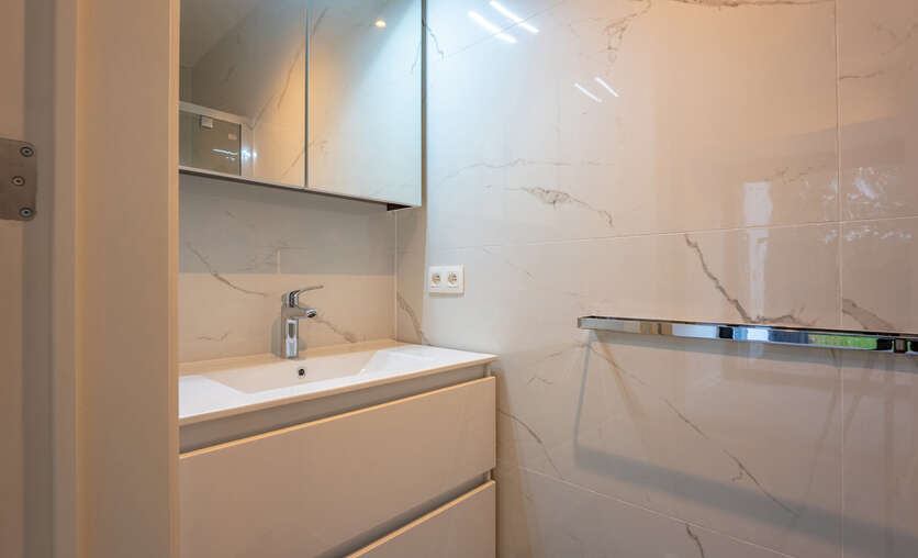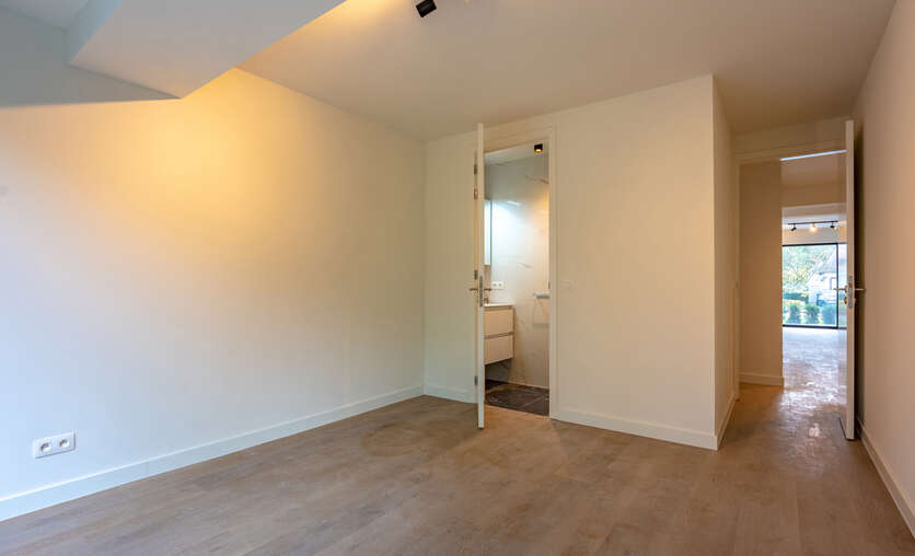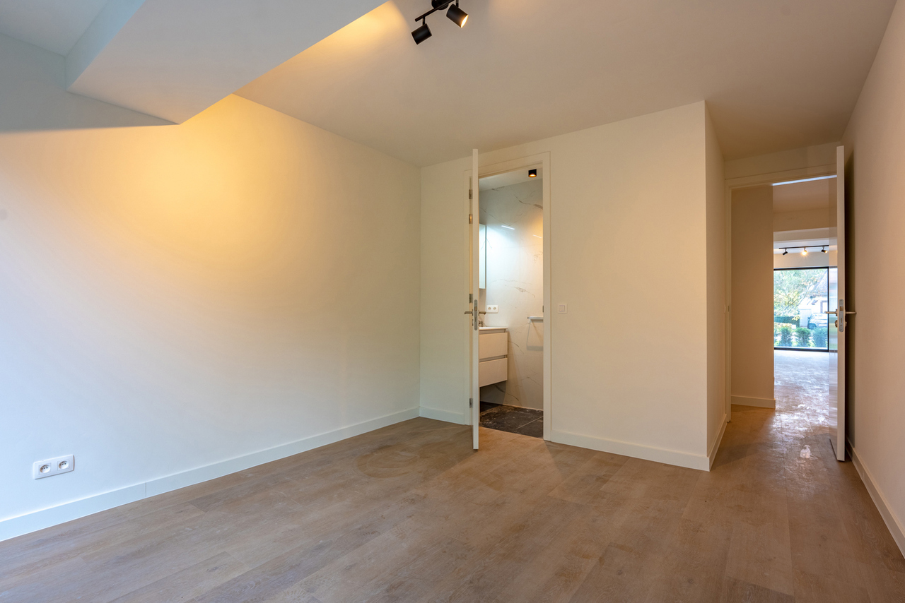Dit gerenoveerd gelijkvloers appartement op wandelafstand van het dorp geniet de volgende indeling: Royale leefruimte (32m²), twee slaapkamers (18m² - 12 m²) beide voorzien van ensuite douchekamer en een apart gasten toilet.