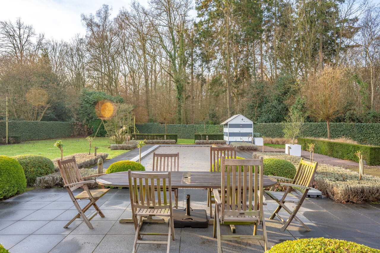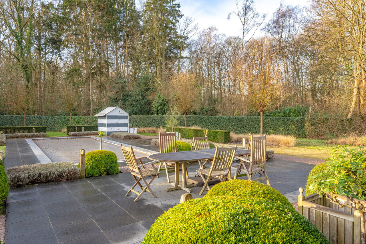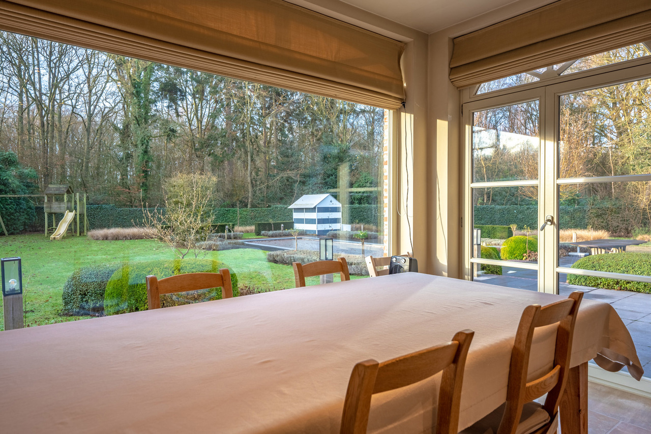 De volwassen tuin is mooi aangelegd en voorzien van een zonnig terras en zwembad (9 x 4) voorzien een rolluik.