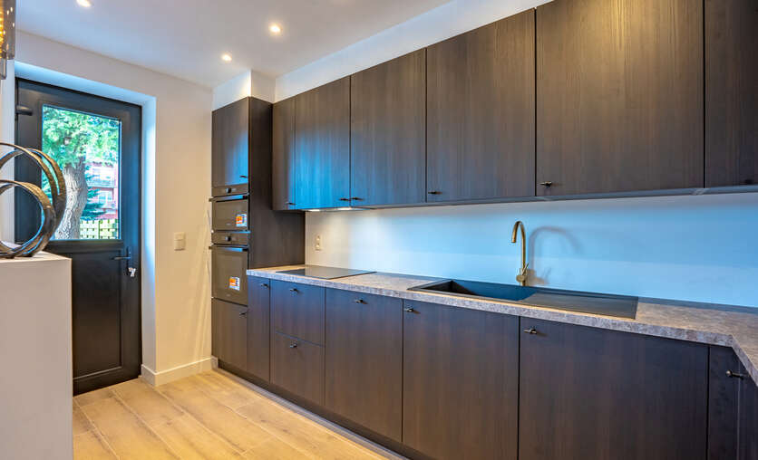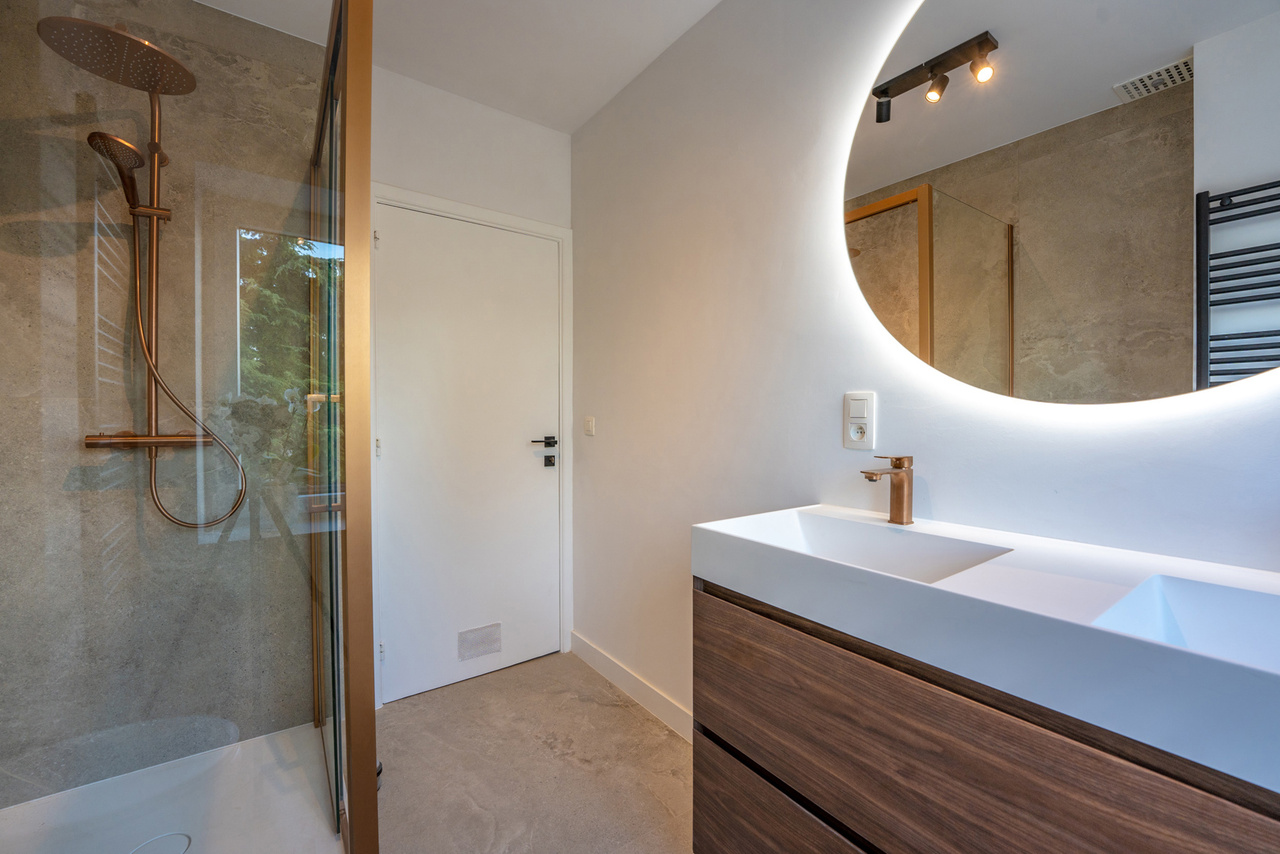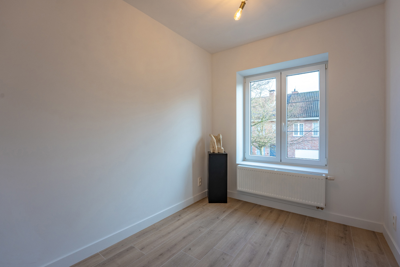 gelijkvloers: inkomhal met apart toilet, living met zicht op tuin en nieuwe open keuken voorzien van alle toestellen.