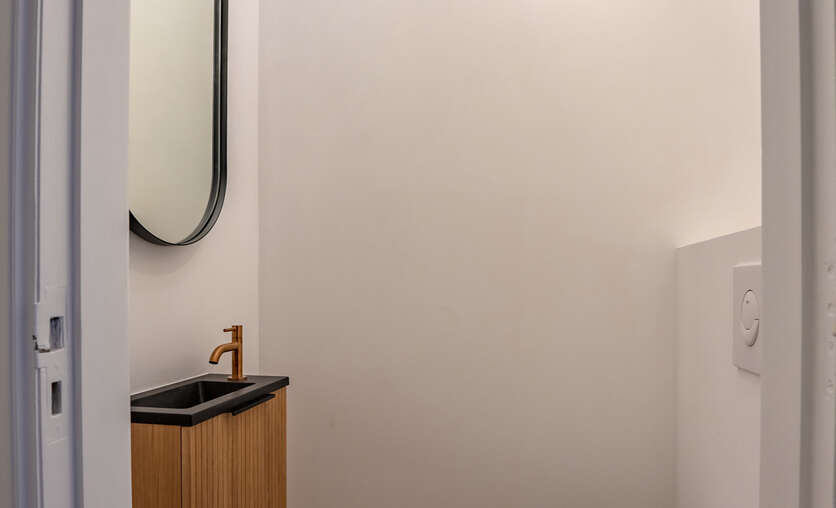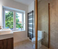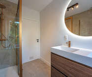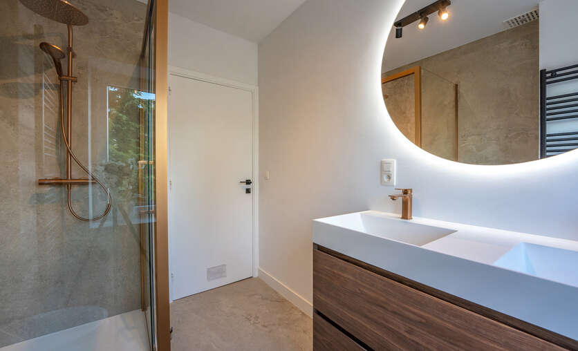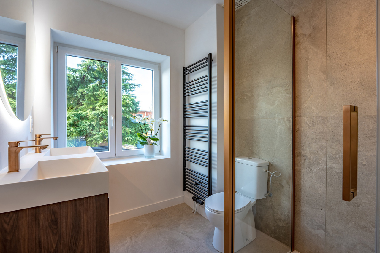 verdiep: drie slaapkamers (15m² - 14m² & 7,5m²) en een nieuwe badkamer voorzien van douche, toilet en dubbele wastafel.