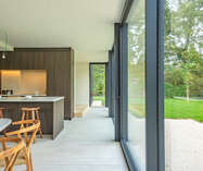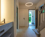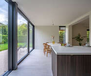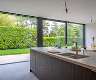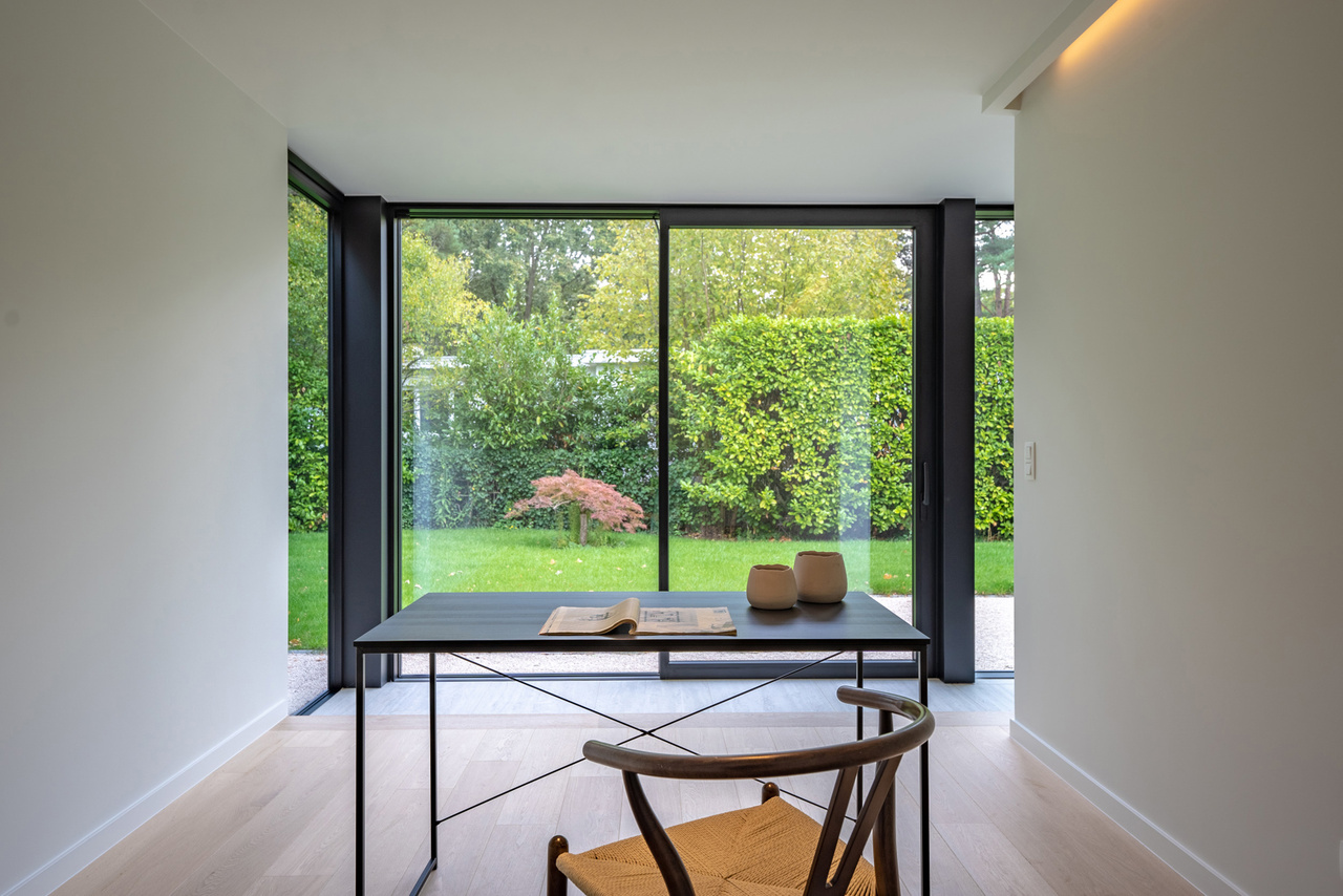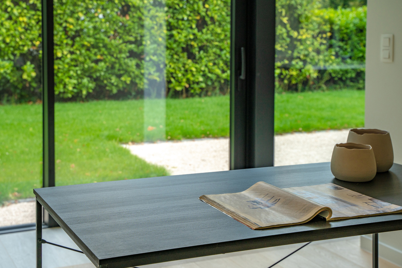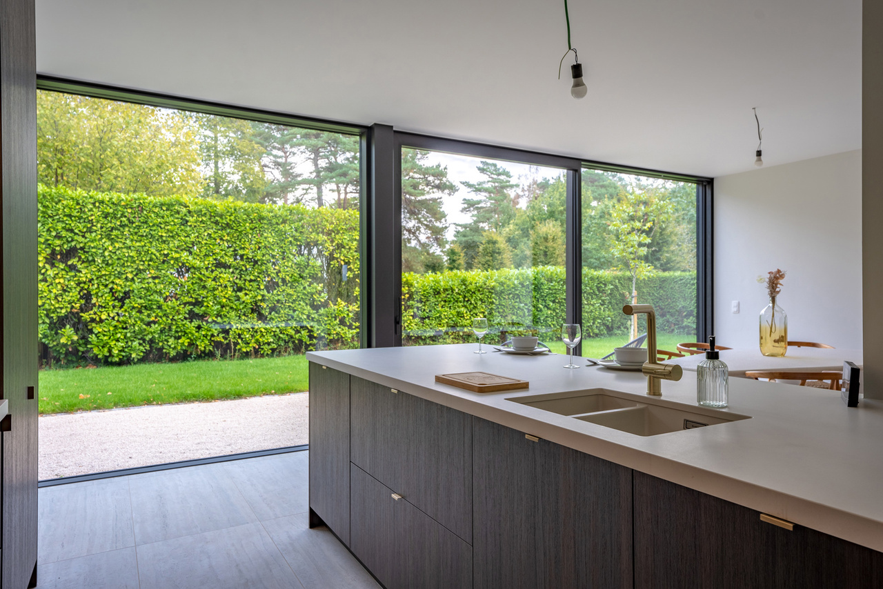 gelijkvloers: inkomhal met vestiaire en apart gastentoilet. Middels een smeedijzeren deur betreedt u de royale zithoek dewelke verder uitloopt naar de eetkamer en open leef-keuken met open zicht naar de tuin. Verder (naast de keuken) nog een bureelruimte/leeshoek of speelruimte met tevens zicht op groen. Via de keuken is er toegang naar de vestiaire en de ruime berging/wasruimte.