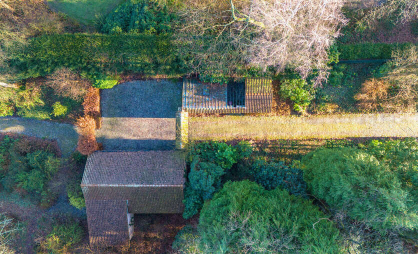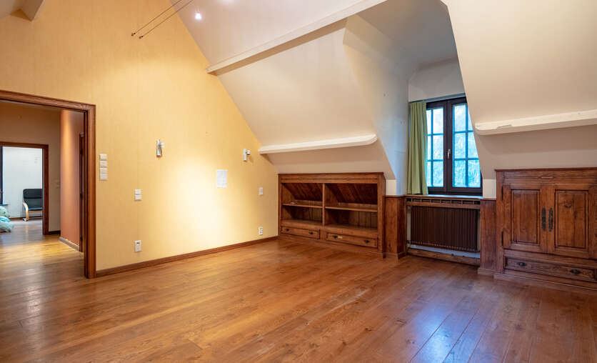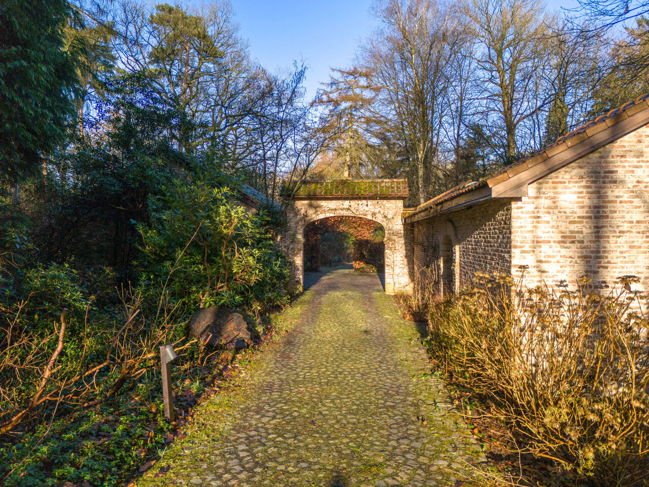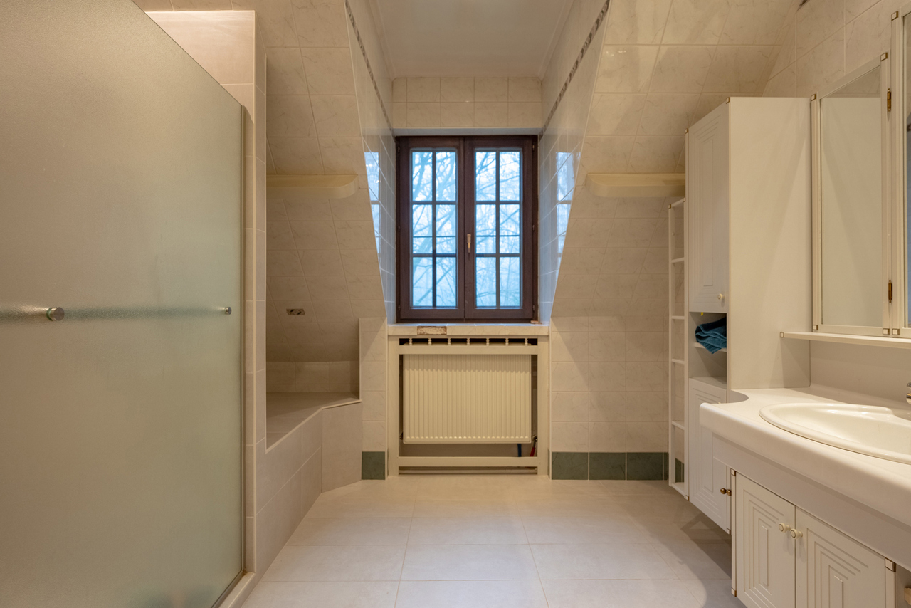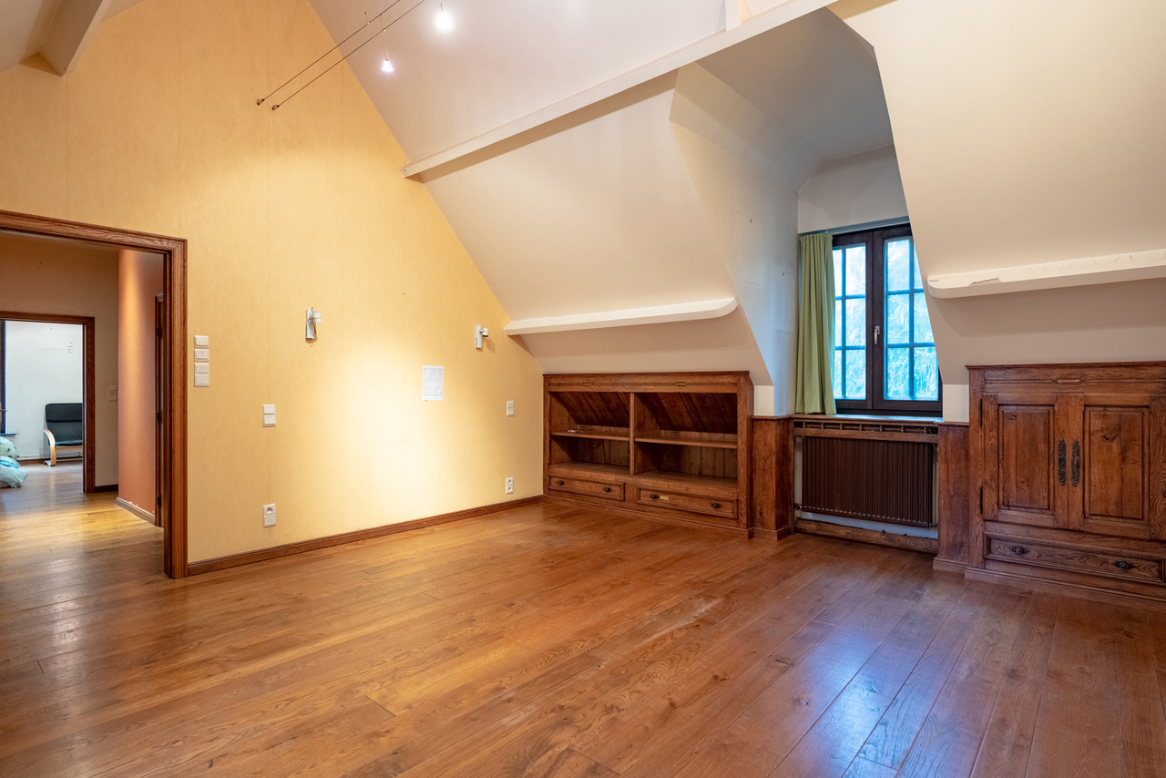 Via een oprijlijn betreedt u het domein met als achterbuur het 149 ha groot Peerdsbos. Midden de oprijlijn bevindt zich de garage voorzien voor 3 wagens (berging en sanitair tevens voorzien).