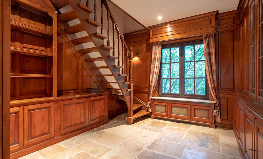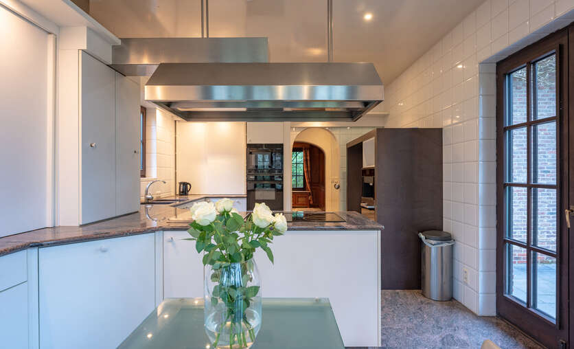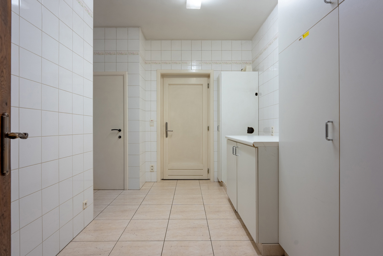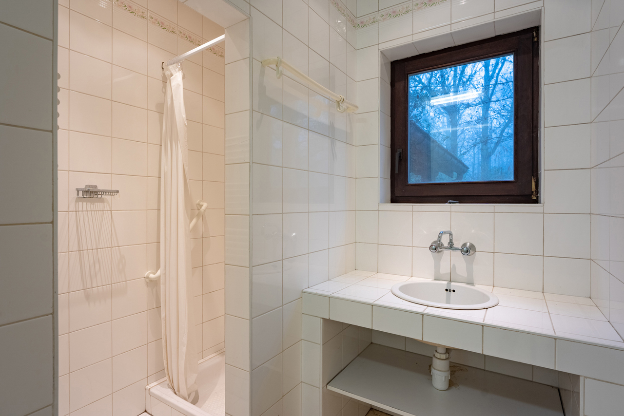 De woning zelf is voorzien van een centrale inkomhal, een wasruimte met doucheruimte, een apart toilet, een keuken met erker en zicht op de tuin, een royale living (92m²) met houthaard.