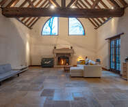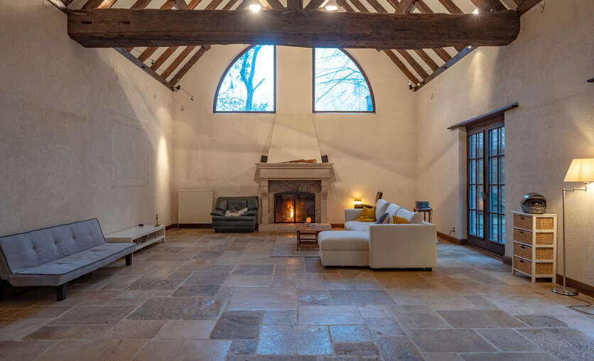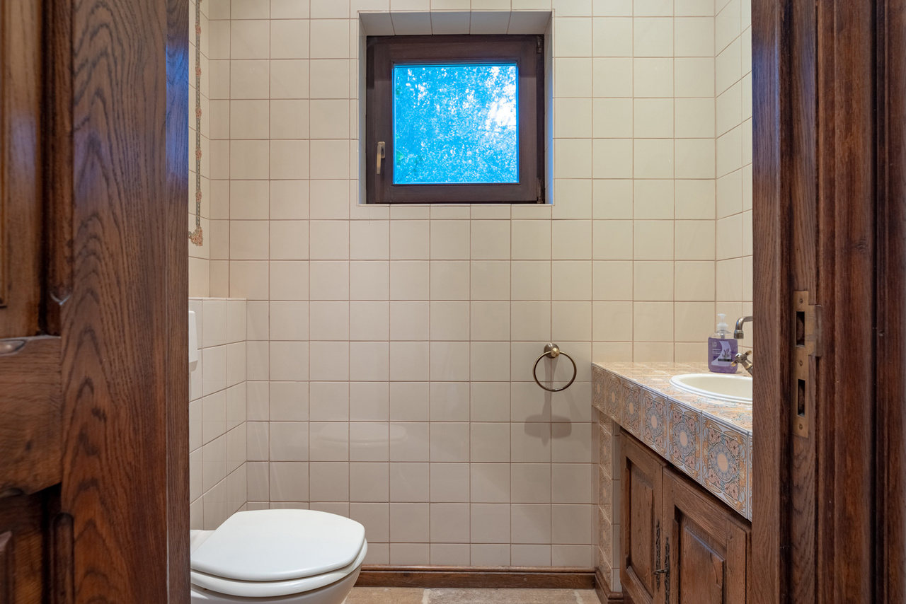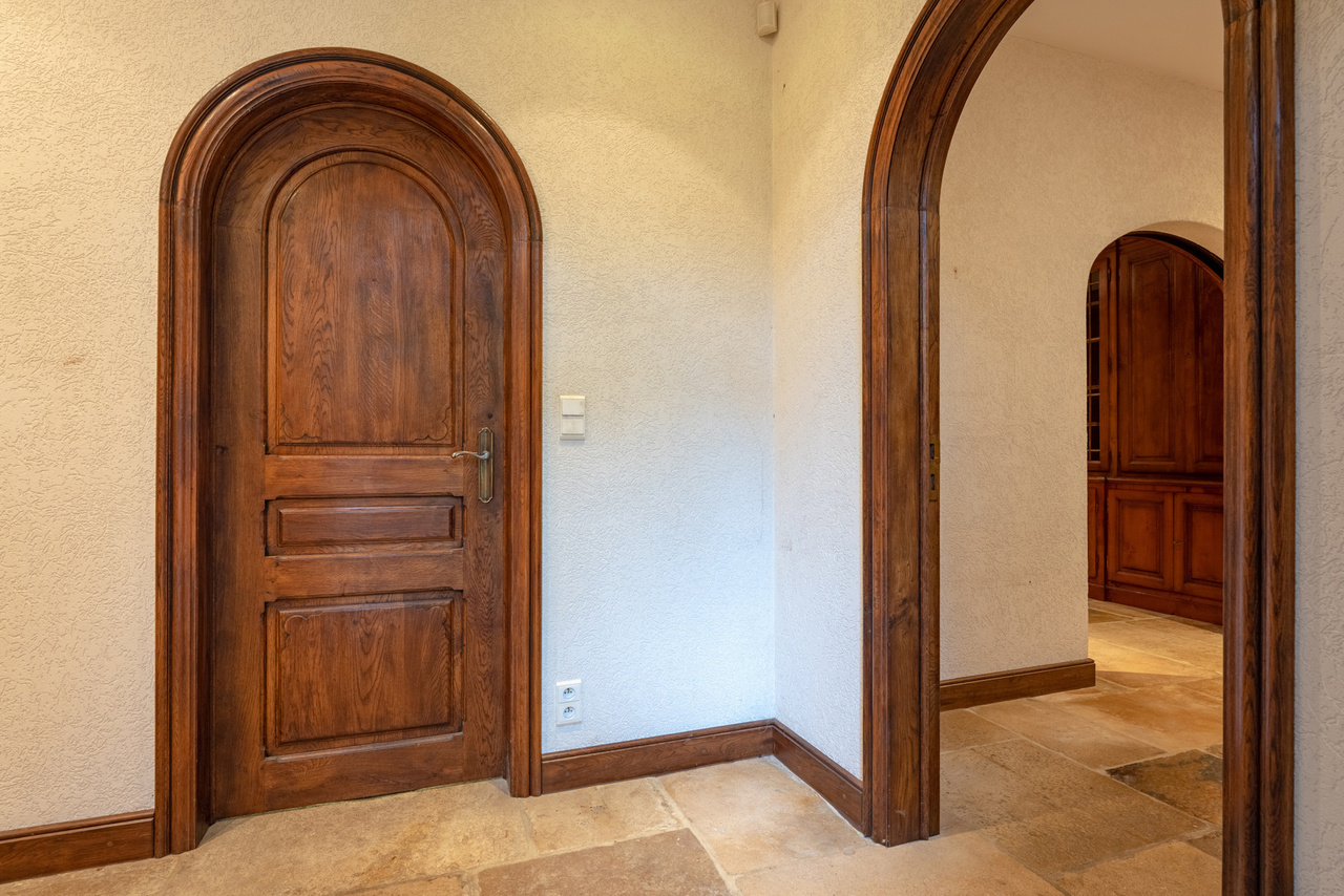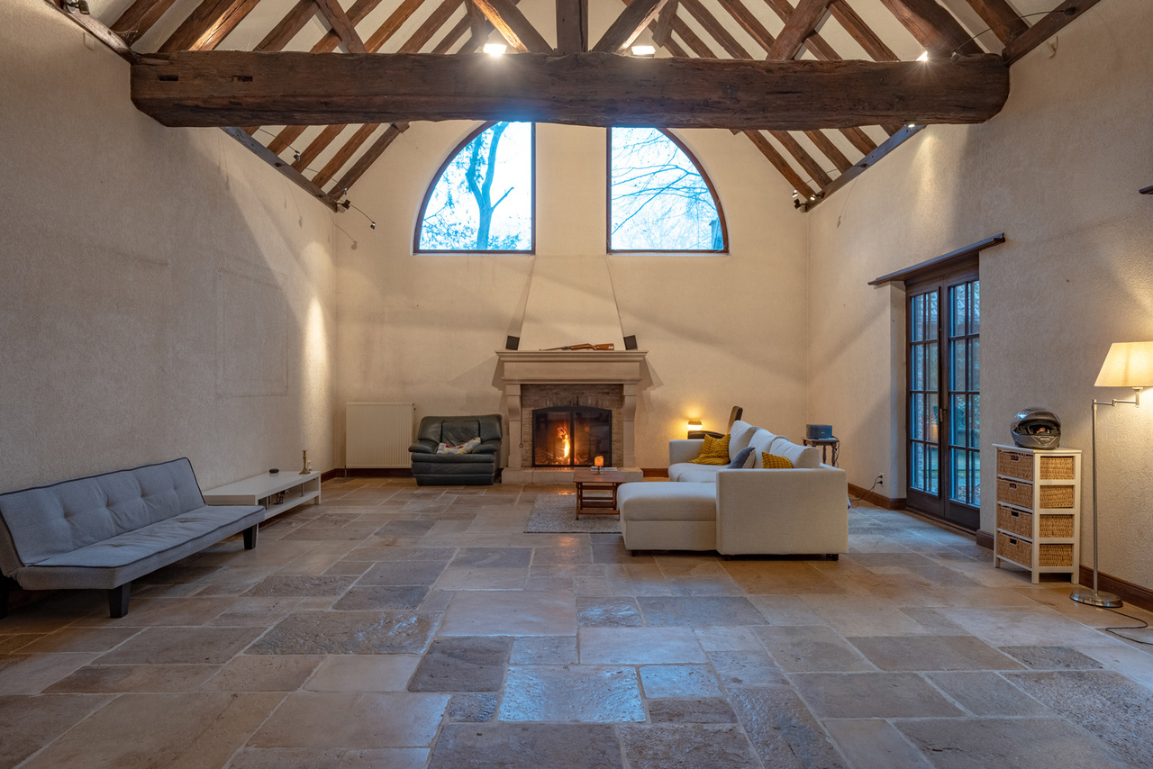 De woning zelf is voorzien van een centrale inkomhal, een wasruimte met doucheruimte, een apart toilet, een keuken met erker en zicht op de tuin, een royale living (92m²) met houthaard.